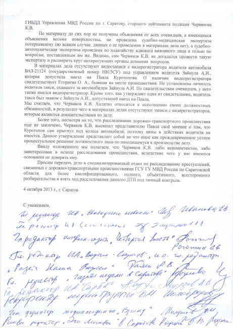 В своем письме журналисты указали на то, что хотя ДТП на Вольской, между улицами Зарубина и Посадского произошло еще 11 августа этого года, уголовное дело до сих пор не возбуждено, а материал проверки лежит без движения у инспектора по ИАЗ полка ДПС ГИБДД УМВД по Саратову Червякова К.В. Напомним, что ВАЗ-21124 под управлением Зайнулы А.И. сбил Павла Куротопова, в результате тот получил множественные ранения головы, до сих пор он находится в больнице в очень тяжелом состоянии.