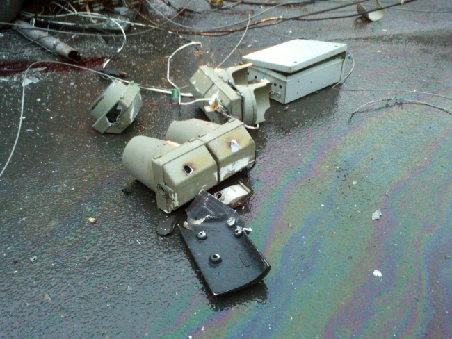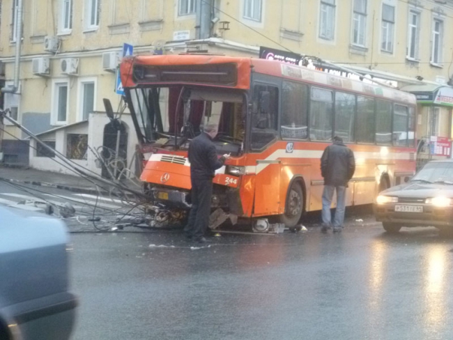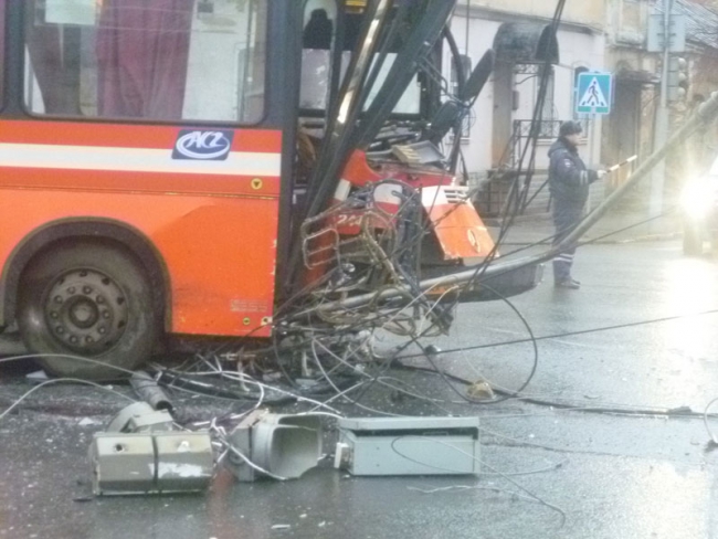 Как сообщили «Четвертой власти» очевидцы, автобус «Мерседес» ехал по улице Московской и на перекрестке с Мичурина снес сразу два столба. На одном из них были размещены светофор, крепления для троллейбусных электропроводов, электрощиток, а также мусорная урна и светодиодное украшение.