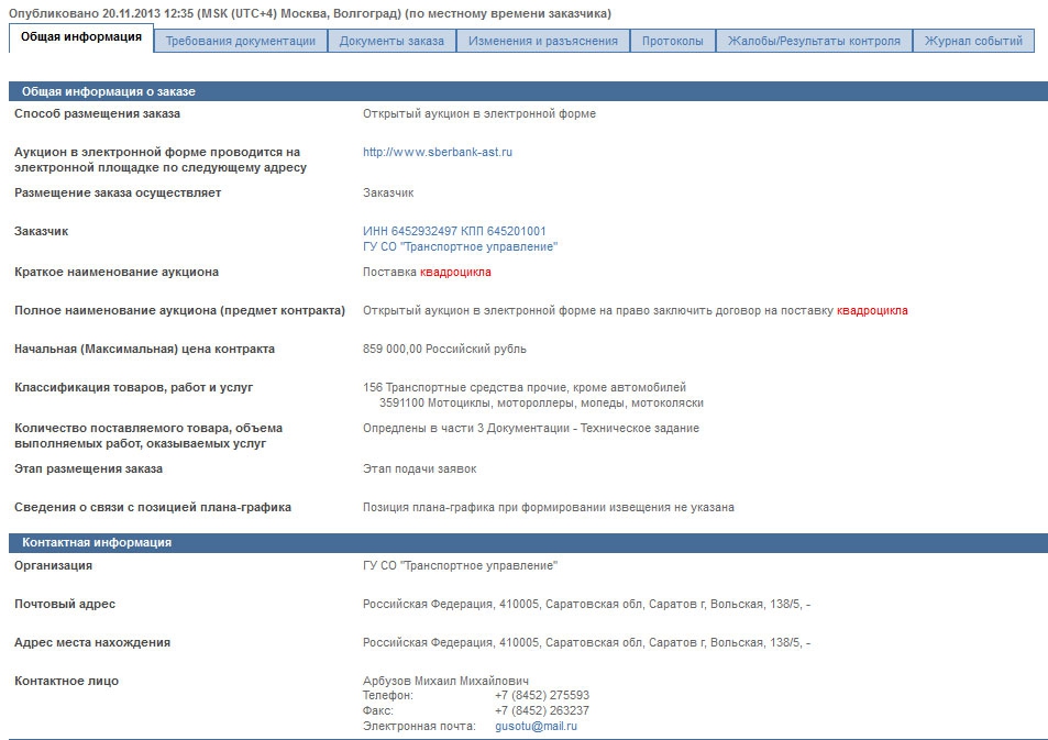 ГУ СО «Транспортное управление» объявило аукцион на поставку квадроцикла. Цена вопроса: 859 тыс. руб. В заявке не сообщается о количестве транспортных средств, необходимых для госслужащих, слово «квадроцикл» везде употребляется в единственном числе.