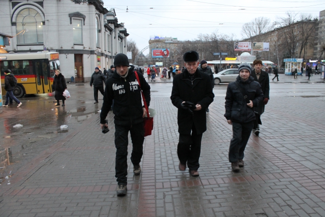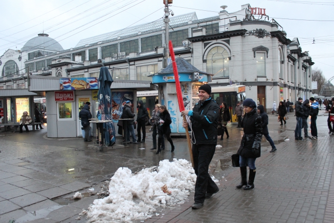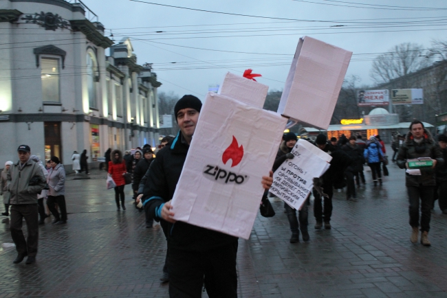 Чуть поодаль, метров на пять отставая от «мохнатого», бежал «факелоносец» - первый секретарь Фрунзенского райкома КПРФ Николай Бондаренко, за спиной которого шел юноша, исполняющий роль сотрудника ФСО. В руках он нес огромную картонную копию зажигалки марки «Zippo», которой периодически «зажигал» постоянно потухающий «факел».