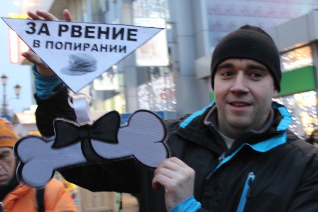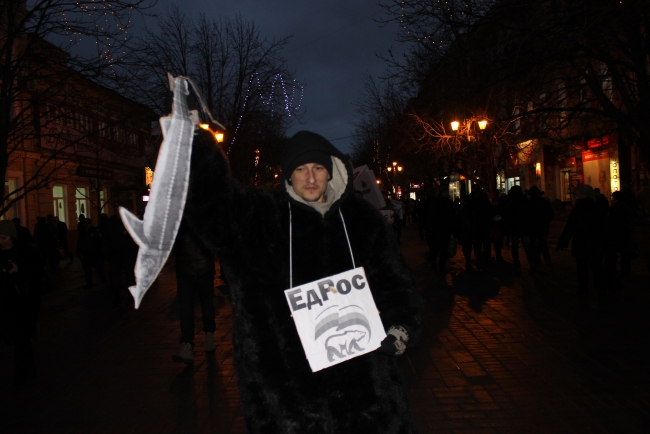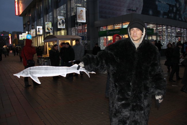 Впереди колонны шли двое молодых людей с картонными автоматами, следом за ними - член КПРФ в шубе «медведя», который держал в руках символизирующую Саратов бумажную стерлядку.