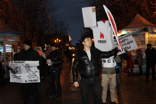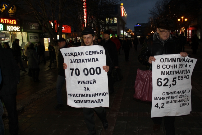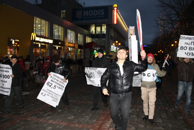 Вокруг всего этого действа следовало несколько коммунистов с плакатами, критикующих чрезмерные расходы на проведение Зимних игр в Сочи.