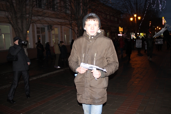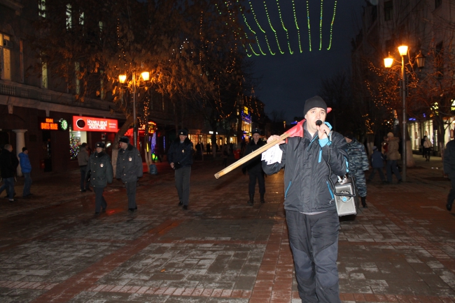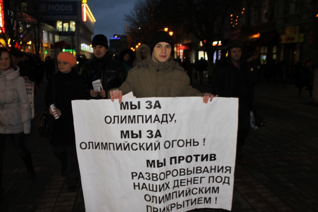 Замыкал колонну первый секретарь саратовского горкома КПРФ Александр Анидалов, с громкоговорителем в руках. «Денег, потраченных на Олимпиаду в Сочи, хватило бы, чтобы полностью перевооружить ВВС и ПВО страны! Сейчас у нас могут подняться в воздух 250 боевых самолетов! За эти деньги мы могли тысячу сверхсовременных самолетов поставить на вооружение! 1/6 части потраченных денег хватило бы, чтобы полностью решить проблемы нехватки детских садов в стране. На Олимпиаду в Сочи израсходовали 62 млрд евро, на предыдущую зимнюю Олимпиаду в Ванкувере было потрачено только 4 млрд рублей. Мы что, настолько богаче канадцев?» - обращался к прохожим через усиливающее звук устройство Анидалов.