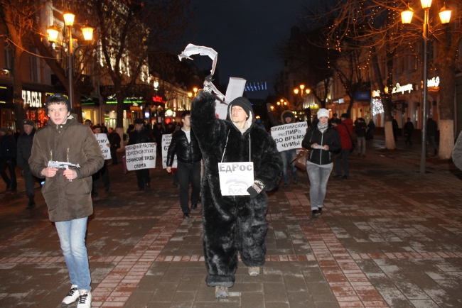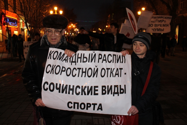 Вчера в Саратове состоялось театрализированное шествие КПРФ по проспекту Кирова, имитирующее и высмеивающее проведение эстафеты олимпийского огня и чрезмерные, на взгляд коммунистов, расходы на проведение Зимних игр.
