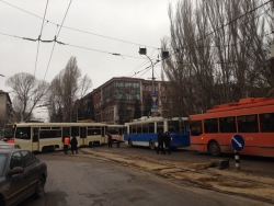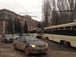 Инцидент стал причиной крупного затора на Астраханской и Вавилова, кроме того, от Мирного переулка до сошедшего вагона стоит несколько трамваев.