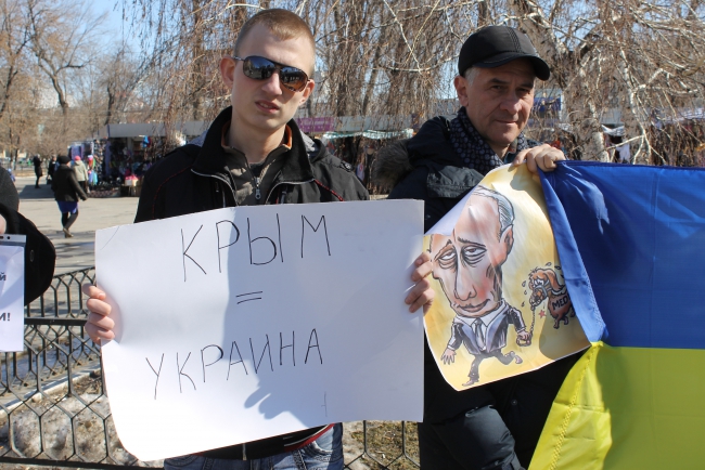 В Саратове состоялась акция, участники которой выступили против российского присутствия на территории полуострова Крым. Формально он принадлежит еще Украине, но на этой неделе власти Автономной Республики провозгласили декларацию о независимости, а завтра состоится референдум, на котором будет решаться вопрос о вхождении региона в состав России.