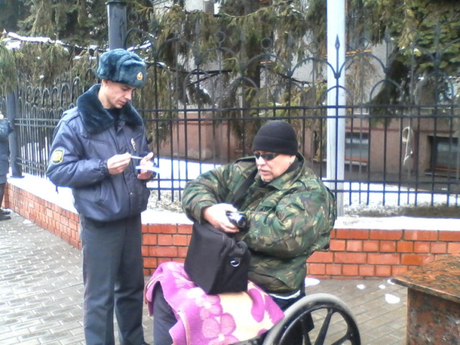 Инвалид из Поповки Владимир Емельянов, который проводит очередной пикет у здания прокуратуры Саратовской области, утверждает, что полиция пытается убрать его от здания. В настоящее время одна полицейская машина стоит на углу улицы Григорьева, а второй автомобиль с надписью «Дежурная часть» - прямо напротив организатора одиночного пикета. Несколько минут назад из него вышли два стража порядка. Представившись сотрудниками отела полиции №1, они вежливо поинтересовались у инвалида, что он тут делает.