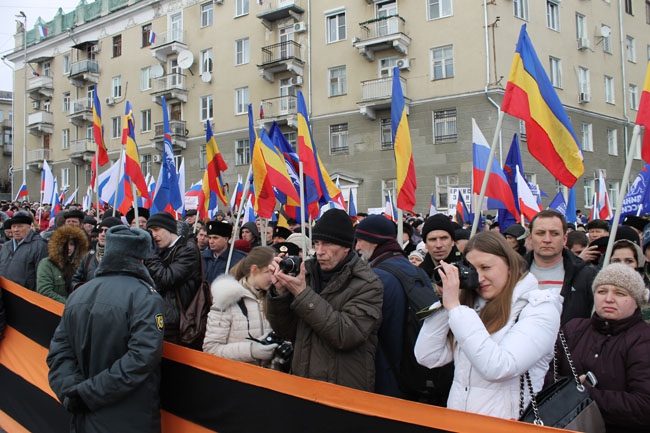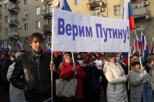 В рамках собравшиеся держали плакаты, гласящие: «Президент - молодец», «Крым мы с тобой», «Родные, мы с вами», «Крым, Россия - вместе навсегда», «Россию и Украину не разделить».