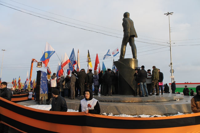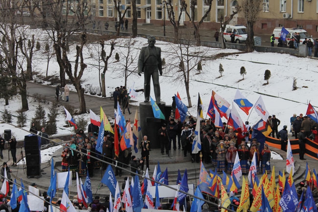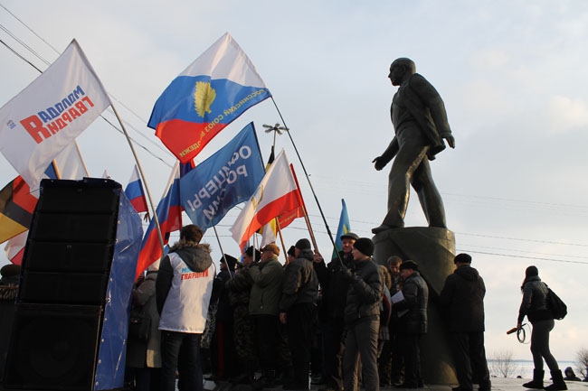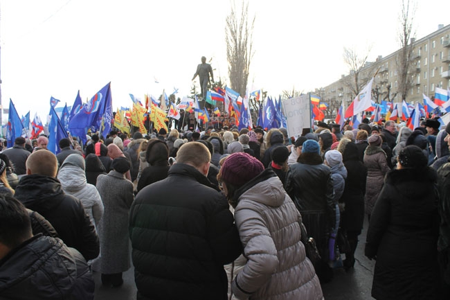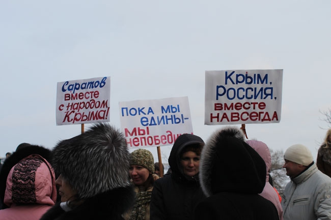 Вчера в Саратове у памятника Гагарину в 18.00 состоялся торжественный митинг по случаю присоединения Крыма в состав России. В мероприятии, по официальным данным, приняло участие около 5 тысяч горожан.