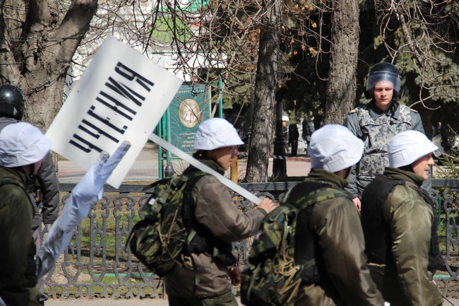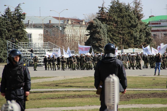 Как передает корреспондент «Четвертой власти» с места событий, бойцы в камуфляжной форме получили белые каски, а также плакаты и растяжки с надписями «Учения». Они выкрикивают различные фразы, но общей тематики нет. При этом «ряженые» громко стучат палками, показывая агрессию.