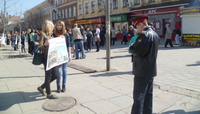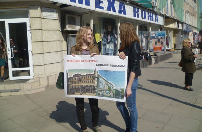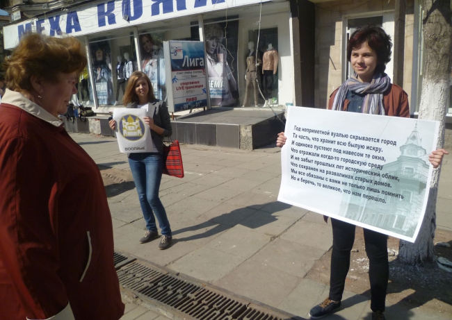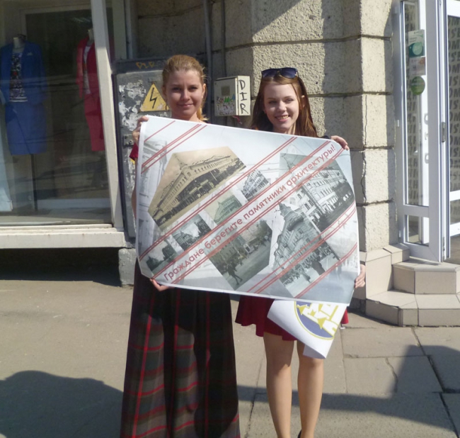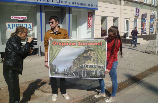 Организаторами акции стало Саратовское реготделение Всероссийского общества охраны памятников истории и культуры (ВООПиК). Около здания выстроились порядка 20 активистов - в основном девушек, студенток кафедры архитектуры СГТУ. В руках они держали красочные плакаты со следующим содержанием: «Не сберечь гостиницу «Россия», расписаться в собственном бессилье», «Откроем занавес», «Меньше культуры - больше рекламы».