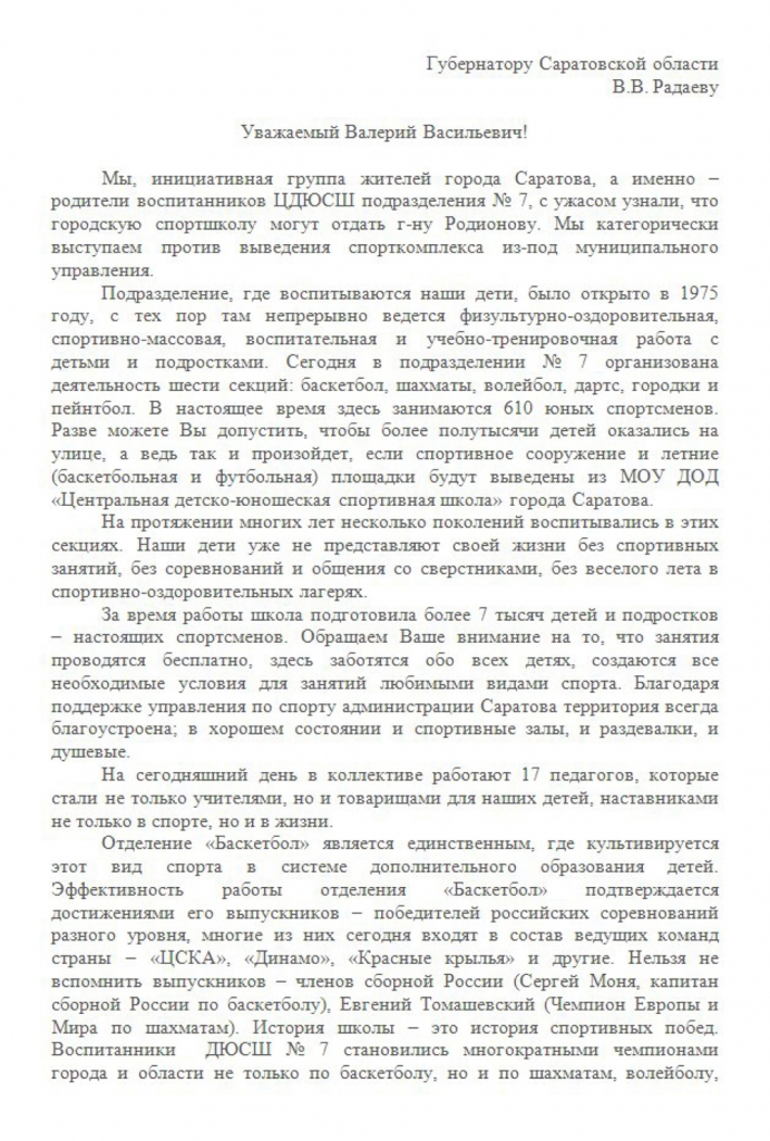 Родители воспитанников ДЮСШ-7 обратились к Радаеву