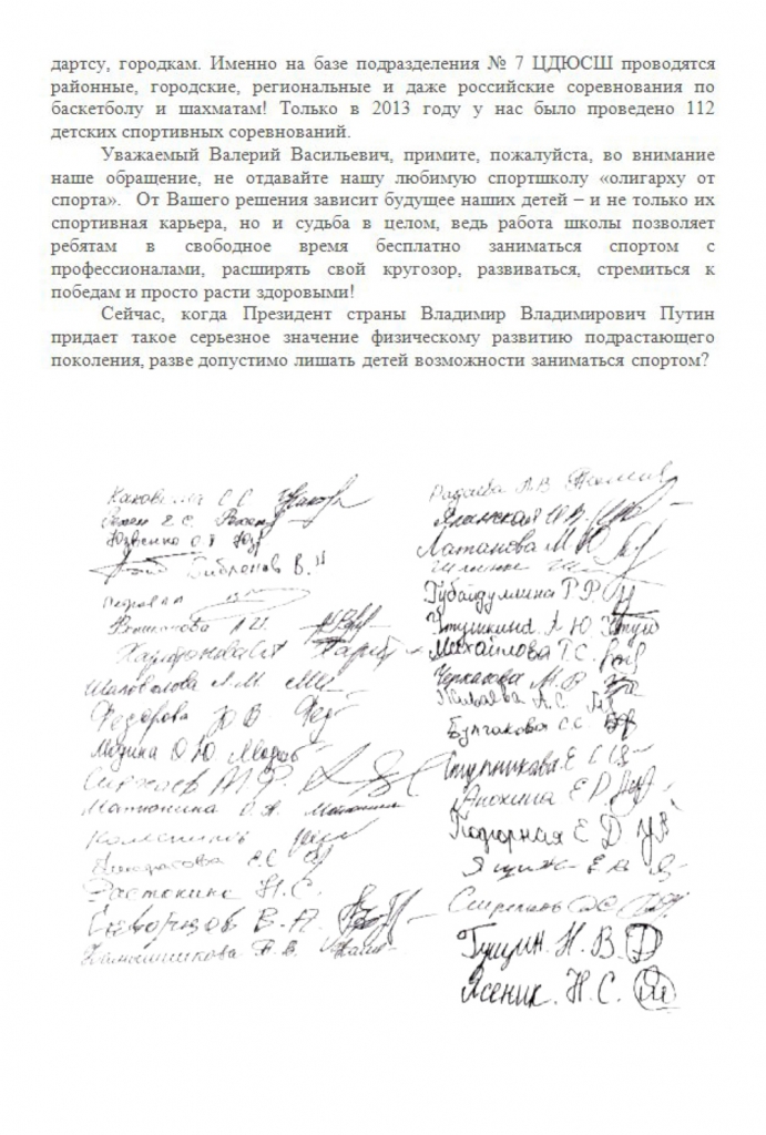 Родители также высказывают мнение, что эти мероприятия делаются специально для президента баскетбольной команды Владимира Родионова «Уважаемый Валерий Васильевич, примите, пожалуйста, во внимание наше обращение, не отдавайте нашу любимую спортшколу «олигарху от спорта», - отметили они.