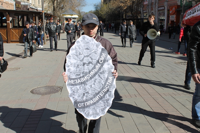 В минувшую субботу в Саратове состоялась акция против давления на СМИ. Участники акции совершили театрализованное шествие по проспекту Кирова, пытаюсь таким образом выразить свой протест против ужесточения контроля за средствами массовой информации.