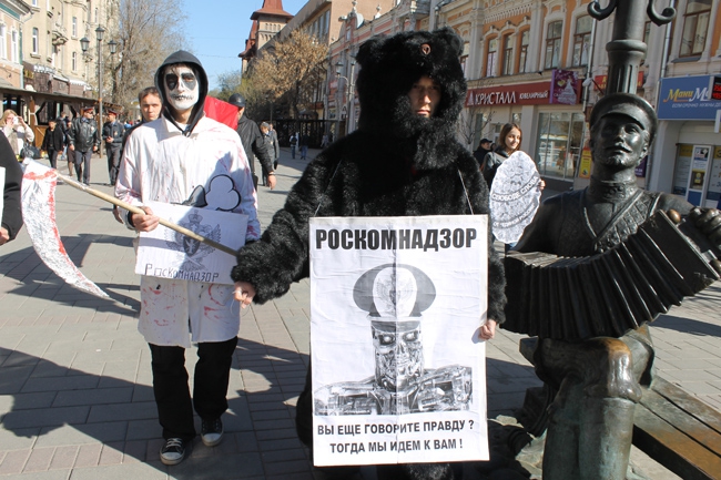 Впереди колонны шло два персонажа: «смерть с косой» (точнее переодетый в нее активист КПРФ) на груди у которого была табличка с надписью «Роскомнадзор» (госорган, контролирующий СМИ) и символ «Единой России» - «медведь» (одетый в искусственную шкуру животного участник маскарада), который нес плакат с изображением страшного робота-киборга и надписью: «Роскомнадзор. Вы еще говорите правду? Тогда мы идем к вам». Справа и слева от этих двух «колоритных» оппозиционеров шли активисты с плакатами «говори и улыбайся» (над фото было изображение девушки с зашитым ртом) и «Есть такая профессия родине врать».