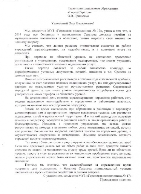 Медперсонал поликлиники саратовской поликлиники №17 опасается перевода на областной уровень. Медики обратились с письмом к главе Саратова Олегу Грищенко с просьбой оставить учреждение в системе муниципального здравоохранения.
