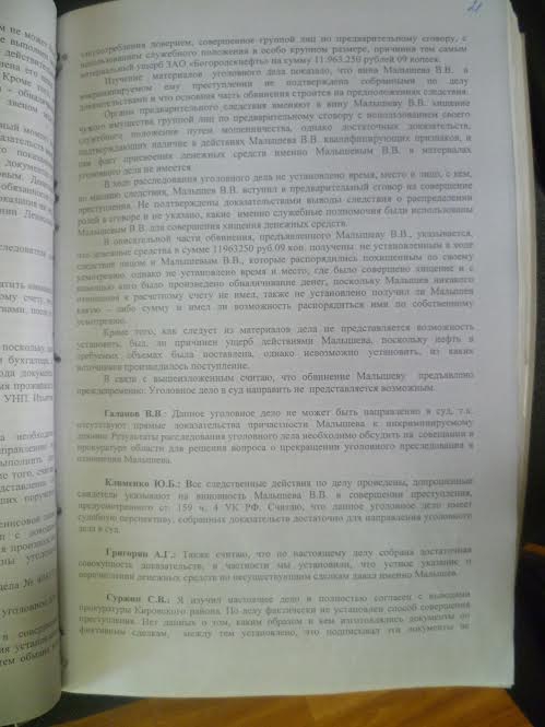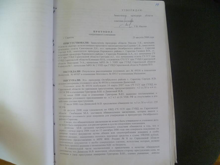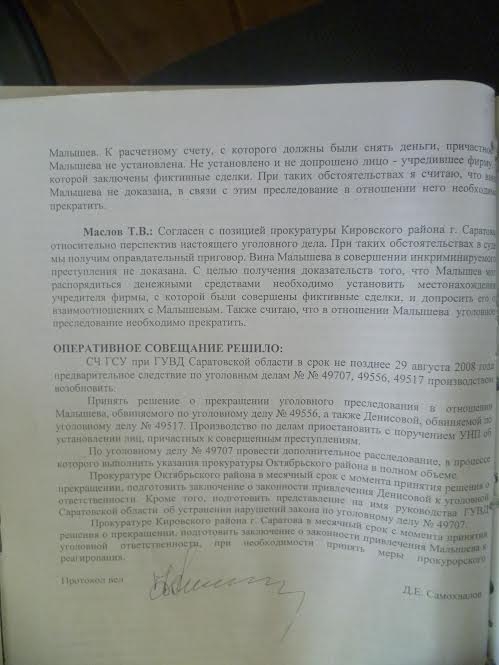 В частности, сотрудники полиции настояли на том, чтобы дело было передано в суд, поскольку все необходимые следственные действия были проведены. Выслушав выступающих стражей порядка, прокуроры не согласились с ними. Вот что, например, сказал заместитель прокурора Кировского района Виталий Галанов : «Данное уголовное дело не может быть направлено в суд, т.к. отсутствуют прямые доказательства причастности Малышева к инкриминируемому деянию». Его поддержал начальник отдела по надзору за исполнением налогового законодательства прокуратуры Саратовской области Сергей Суржин: «Я изучил настоящее дело и полностью согласен с выводами прокуратуры Кировского района. По делу фактически не установлен способ совершения преступления. Нет данных о том, каким образом и кем изготовлялись документы по фиктивным сделкам, между тем, установлено, что подписывал эти документы не Малышев. К расчетному счету, с которого должны были снять деньги, причастность Малышева не установлена». И, наконец, заместитель прокурора Саратовской области Тимур Маслов подвел итог этой беседе.