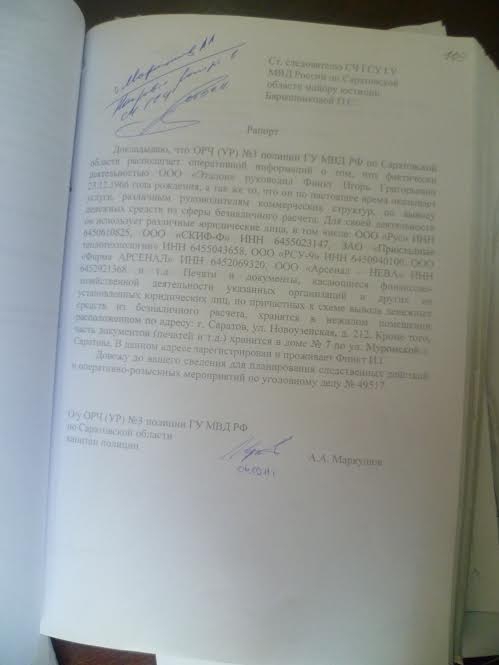 Представили Малышева предоставили суду еще один любопытный документ: рапорт старшего следователя СЧ ГСУ ГУ МВД России по Саратовской области от 2011 года. Так вот согласно этой бумаге Игорь Финкт - он считается владельцем фирмы «Эталон», через которую Владислав Малышев якобы «обналичил» деньги, - до сих пор занимается «обналичкой». Оказывается, для своей деятельности он использует различные организации, следователь перечислил 6 таких фирм.