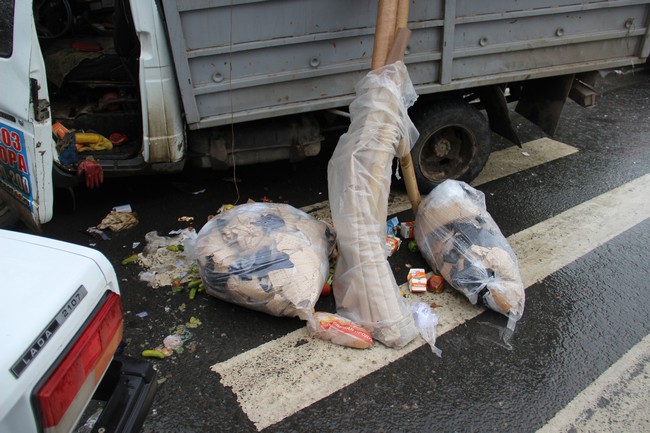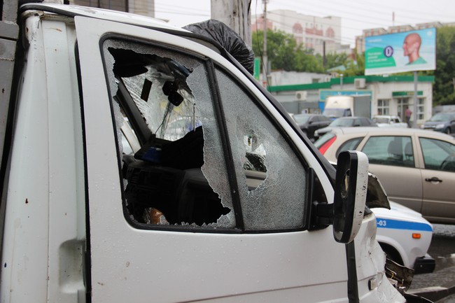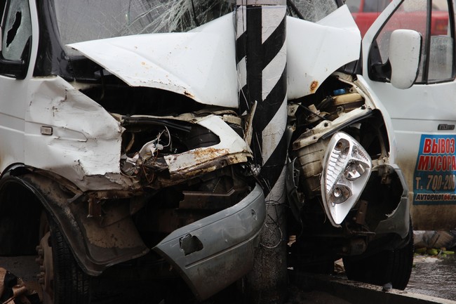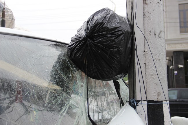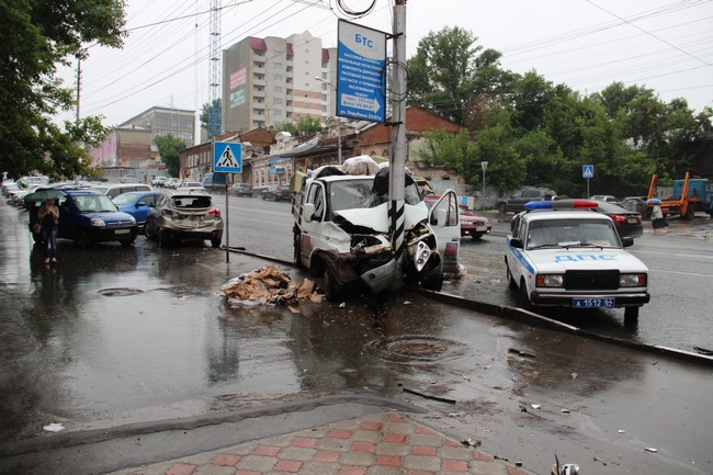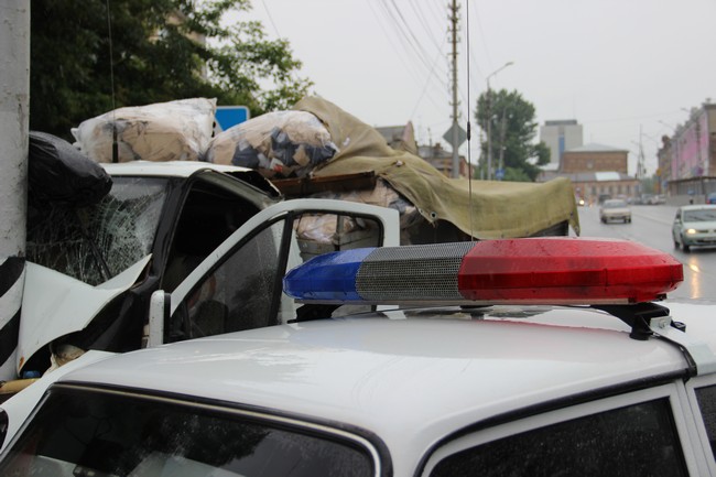 В результате наезда на столб, передняя часть автомашины оказалась полностью разбита (удар пришелся по центру). Известно, что по пути грузовой автомобиль задел еще как минимум одну машину («Хендай»), она стоит позади «ГАЗели» в противоположном направлении. В районе ДТП вокруг разбросан мусор, вылетевший через борт грузовой автомашины.