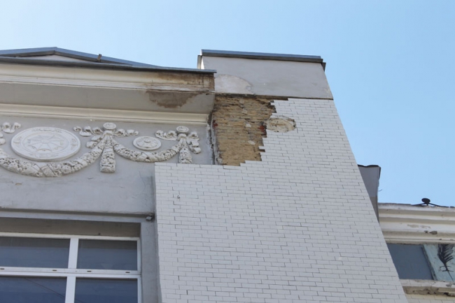 Как рассказал один из рабочих, фасад начал рушиться после последнего сильного дождя. Здание огородили, чтобы не допустить падение кирпичей на прохожих. По его словам, уже была проведена комиссия по ЧП. Не исключено, что сказываются последствия пожара 2 октября 2012 года. Напомним, что тогда в результате возгорания, сильно пострадала кровля здания и ряд помещений.