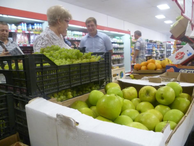 Елена Резепова дошла до прилавка с фруктами. «А яблоки у вас польские?» - спросила она. «Они из Сербии, из Польши», - пояснили ей. Тут к журналистам и проверяющим единороссам подошел некий подвыпивший покупатель и поинтересовался, чем они здесь занимаются. Когда узнал, что работают представители «Народного контроля», сказал, что в «Пятерочке» просроченные продукты. «Курочки у них там зелененькие», - сообщил он. После этого проверяющие пошли в «Пятерочку», но никаких «зеленых курочек» там не нашли. Единороссы опросили нескольких покупателей. Но те не выразили обеспокоенность введенными санкциями. Пенсионерка Галина Орехова пожелала, чтобы колбасы было поменьше, но она была качественной. Вторая покупательница Галина Гаврилова посетовала, что санкции могут отразиться на бананах, но отметила, что у Путина много друзей в африканских странах и может быть он эту проблему решит.