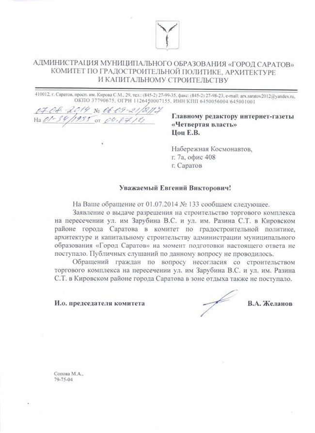 «Четвертая власть» обратилась в комитет капитального строительства Саратова, чтобы проверить правдивость слов представителей коммерческой структуры. Однако там нашему корреспонденту сообщили, что разрешения на строительство торгового объекта в данном месте не поступало. Более того, не проводилось публичных слушаний, по итогам которых можно было строить магазины на муниципальной земле.