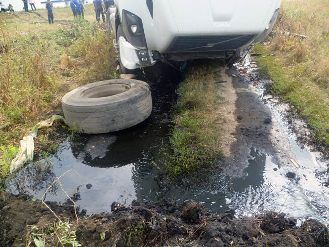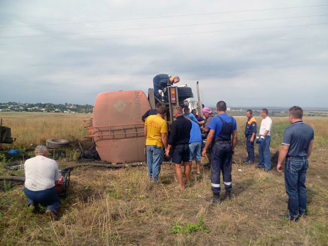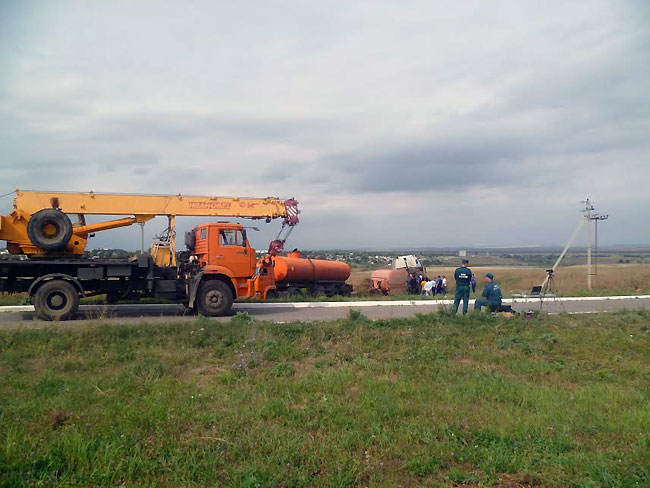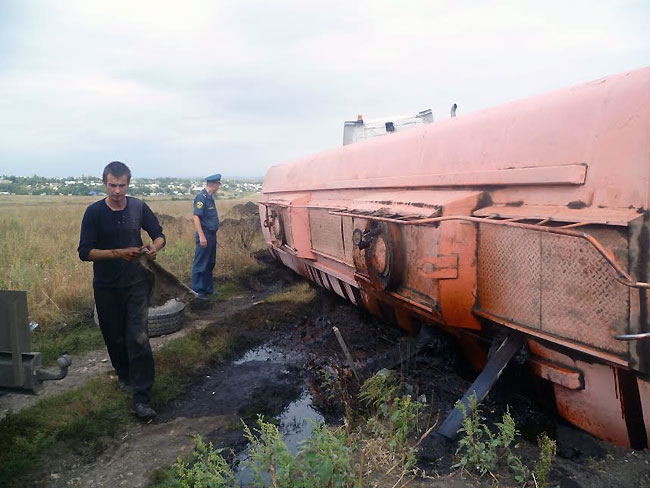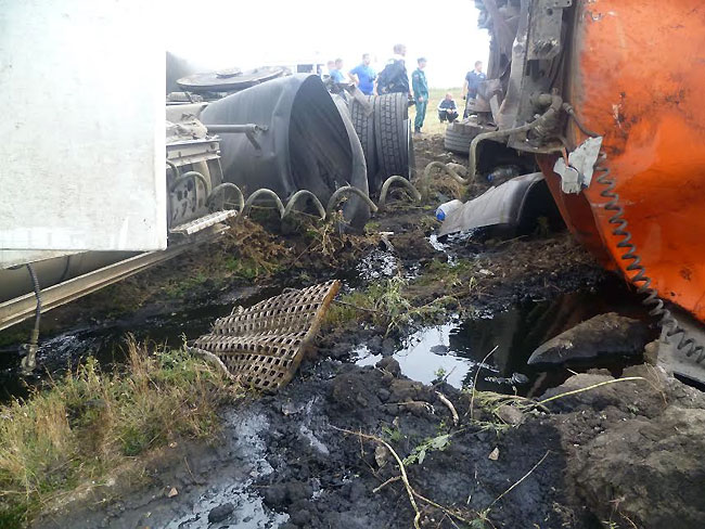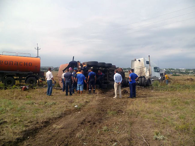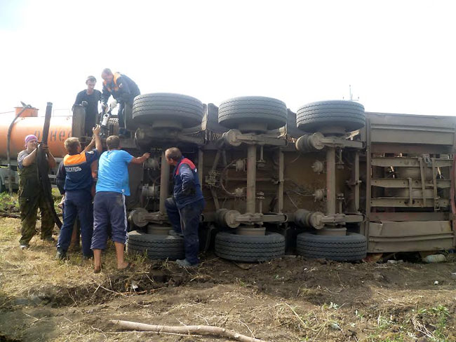 Сейчас землю вокруг грузовика перекопали (сделали обваловку). Первоочередной задачей сотрудники МЧС называют недопущение экологической катастрофы.