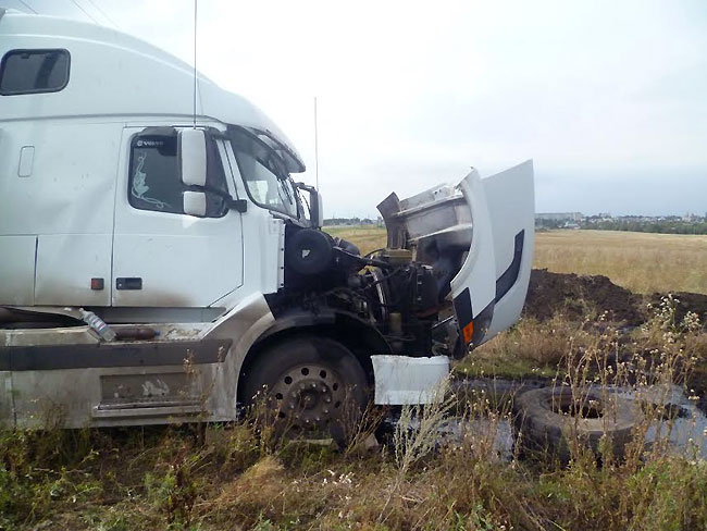 Водитель фуры Сергей рассказал корреспонденту «4В», что вез нефть из Богородского месторождения, расположенного в Духовницком районе, в Татищево. По пути у него начались проблемы с рулем. Он нажал на тормоза, однако машину по инерции опрокинуло в кювет. Цистерна отсоединилась от фуры и, частично повредив кабину, упала на бок.
