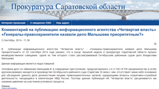 На сайте прокуратуры Саратовской области появилось сообщение с ответом надзорного ведомства на публикацию Интернет-газеты «Четвертая власть» по делу в отношении Владислава Малышева. В ней они называют недостоверной информацию в материале «Генералы-правоохранители назвали дело Малышева приоритетным?», а также обвиняют СМИ в давлении на участников процесса.