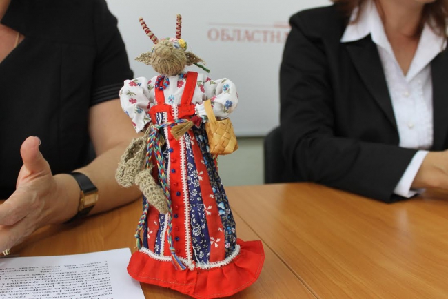 Продолжая свою речь, министр машинально взяла одну тряпичную куклу в виде козы в женском сарафане из числа работ мастеров, разложенных на столе. «Она такая многоликая, красочная и яркая, как вся наша область», - сказала Краснощекова, взглянув на куклу.