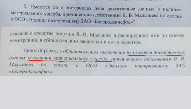 Также в ходе экспертизы пришли к выводу, что в обвинительном заключении нет никаких доказательств того, что при помощи сделки с ООО «Эталон» Малышев причинил своей компании какой-либо материальный ущерб. Напомним, что ЗАО «Богородскнефть», наоборот, получила прибыль.