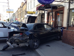 От удара иномарка буквально протаранила вход в магазин «Планета Секонд Хенд». При этом от столкновения оказалась сильно повреждена задняя часть авто, а у магазина погнулась колонна у крыльца. Пострадавших в ходе ЧП нет, отметили собеседники 4В. На входе в торговый объект выставлено объявление, что он работает в обычном режиме.