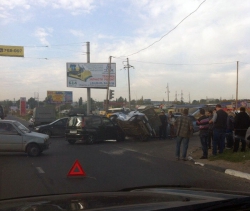 Сегодня в Ленинском районе Саратова произошла массовая авария, в результате которой отечественная легковушка опрокинулась на бок.