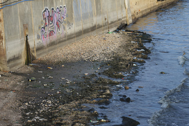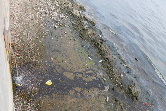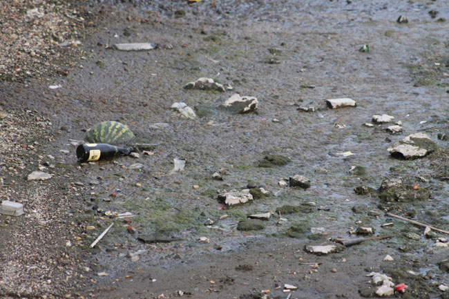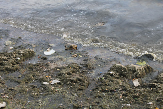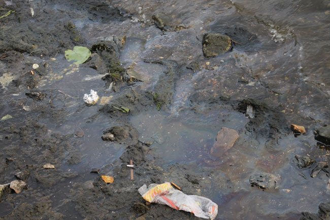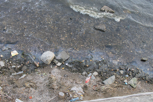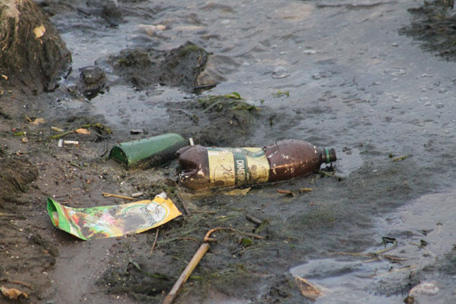 На прибрежной территории теперь разбросаны бутылки и пивные банки, упаковки стиральных порошков и прочие бытовые отходы, оказавшиеся в реке не без помощи человека. Кроме того, по периметру береговой линии заметны следы мазутной жидкости на поверхности речной воды.