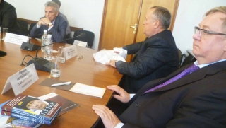 На сегодняшнем кругом столе в ПИУ имени Столыпина советник губернатора Саратовской области, президент Приволжской книжной ярмарки Дмитрий Аяцков подарил президенту Книжной палаты России Сергею Степашину книгу о президенте Путине, которую недавно выпустил Изборский клуб - двухтомник «Путин в зеркале Изборского клуба».