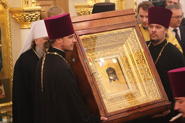 «Для нас большая честь встречать здесь вас и иметь возможность молиться вместе с вами Ваше Святейшество. Для нас патриарх не просто символ, это милостивый отец. Мы ощущаем это всегда. Дай Бог, Ваше Святейшество, чтобы ваше посещение было исполнено пользой для всей Саратовской земли», - обратился к Патриарху митрополит Саратовский и Вольский Лонгин. Он вручил в подарок главе РПЦ копию иконы Спасителя, которая находится в Троицком соборе, куда она была привезена московскими стрельцами.