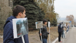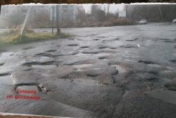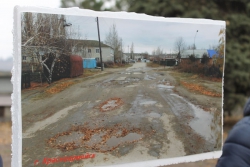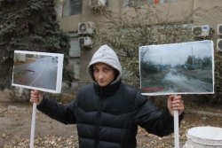 Участники публичной акции стояли под окнами минтранса с табличками, на которых были наклеены изображения разбитых дорог Саратовской области. Основная часть «экспозиций» была посвящена городу Балашову.