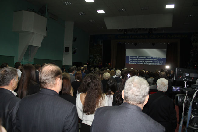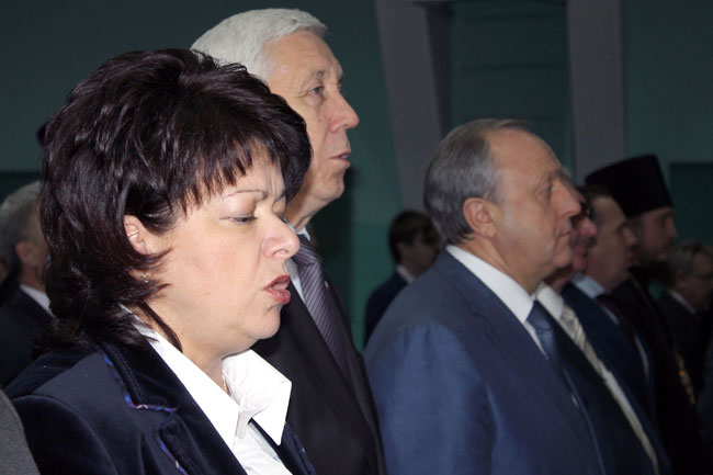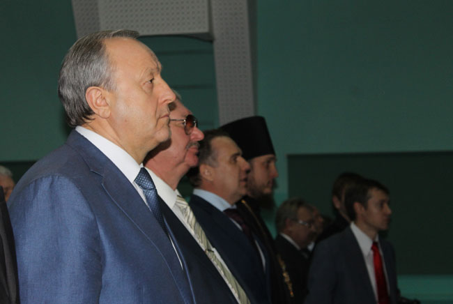 В такт звучавшим на аудиозаписи голосам гимн пели глава Саратова Олег Грищенко, председатель облдумы Владимир Капкаев, главный федеральный инспектор региона Марина Алешина, а также абсолютное большинство рядовых участников форума. Радаев в это время стоял совершенно неподвижно и безмолвно, расправив плечи и устремив свой взгляд вперед.