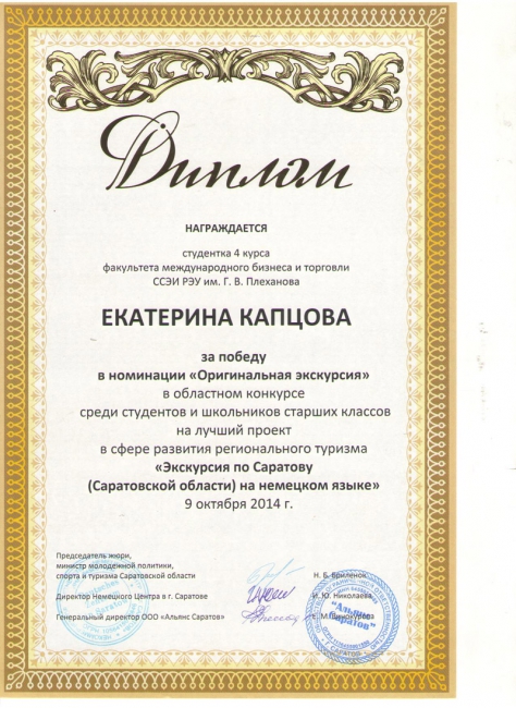 Екатерина Капцова награждена также дипломом за победу в номинации «Оригинальная экскурсия», Татьяна Вильгельм - в номинации «Классическая экскурсия» за экскурсии по Саратову на немецком языке.