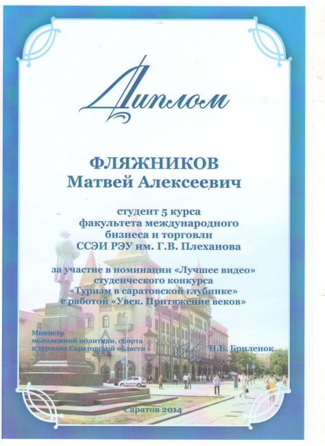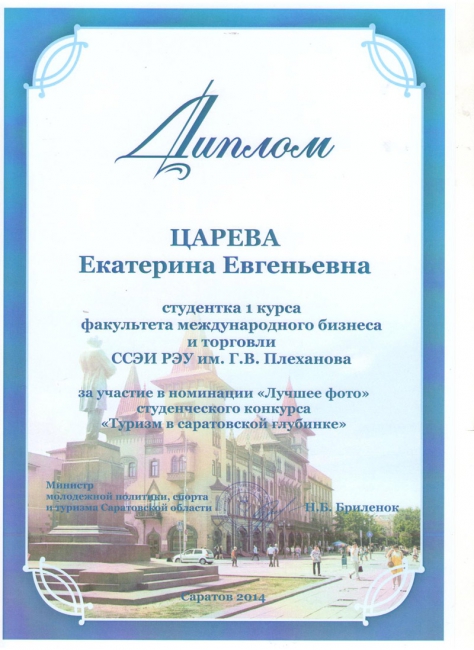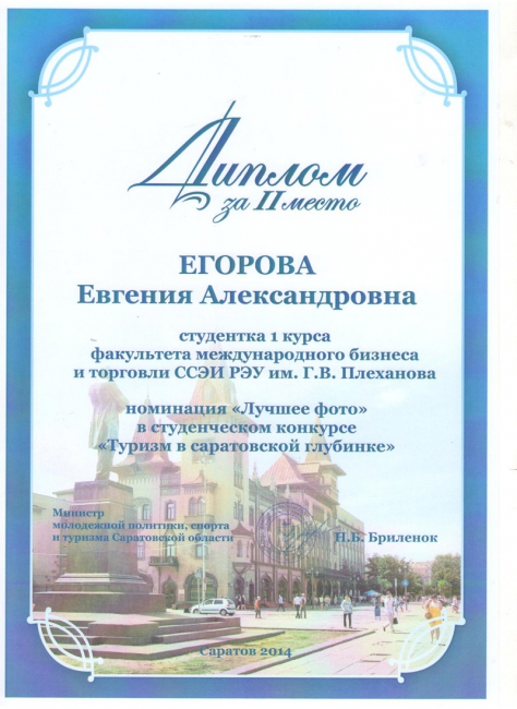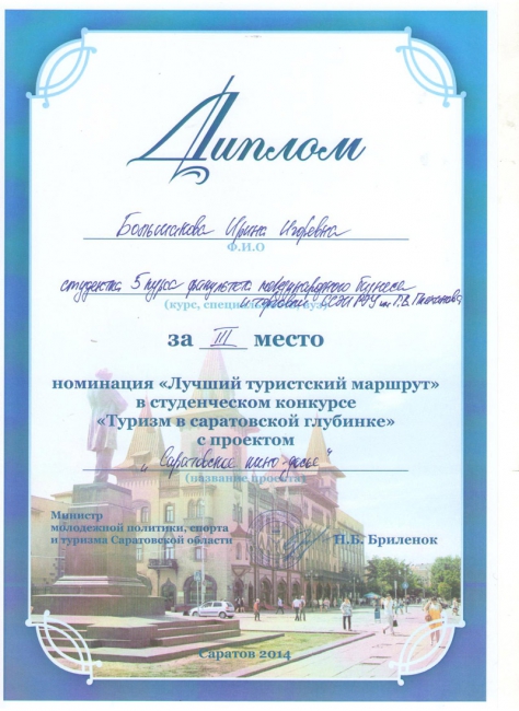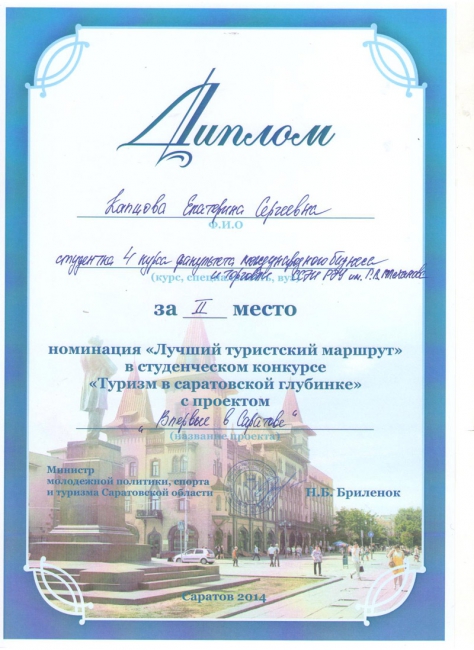 Подведены итоги ежегодного областного конкурса на лучший студенческий проект в сфере развития регионального туризма «Туризм в саратовской глубинке». Из шестнадцати работ, представленных на конкурс, в финал вышли пять студенческих проектов, три из которых были разработаны студентами кафедры гостинично-туристического бизнеса и сервиса ССЭИ РЭУ им. Г.В.Плеханова. По итогам конкурса работы плехановцев заняли все три призовых места.