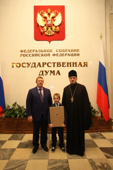 Николай Панков также поздравил 7-летнего Егора Игнатова из города Ртищево (Балашовская епархия) с победой в конкурсе детского рисунка «Красота Божьего мира» и выразил благодарность его родителям за воспитание такого сына. «Такие талантливые дети обладают особым даром, и именно они - будущее современной России», – считает госдеп.