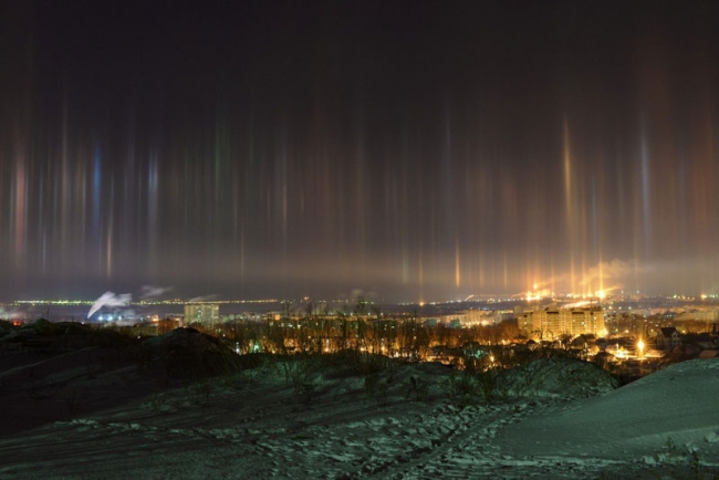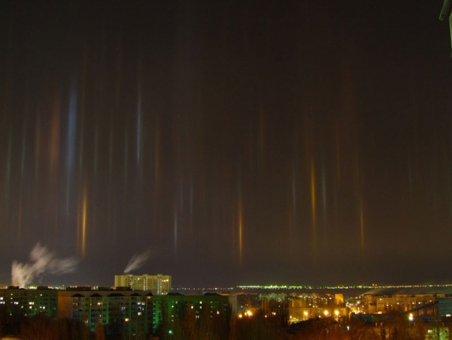 Этой ночью жители Саратова наблюдали над городом красивое атмосферное явление, так называемые световые столбы. Этот оптический эффект объясняется прохождением света через кристаллы льда, содержащиеся в воздухе.