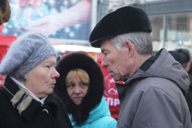 Действительно, никаких работ на площади не велось. На «встрече с депутатом» присутствовало несколько десятков горожан, а также много полицейских, которые фиксировали все происходящее на видеокамеру. Некоторое время стражей порядка с техникой было даже больше, чем представителей СМИ. К каждому депутату был прикреплен свой «оператор», который всюду следовал за ним, что сильно раздражало коммунистов. Младшие однопартийцы загораживали руками камеры, закрывали своими телами коллег. Молодой коммунист Николай Бондаренко несколько раз вставал прямо перед полицейским и в упор снимал его на камеру своего телефона. Горожане также возмущались действиями полиции, но стражи порядка хранили упорное молчание.