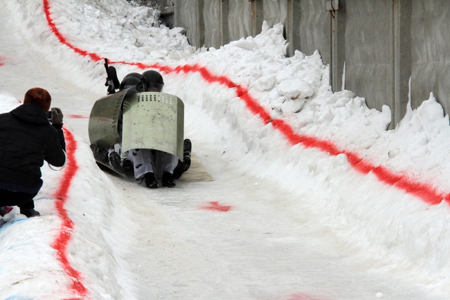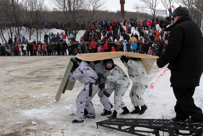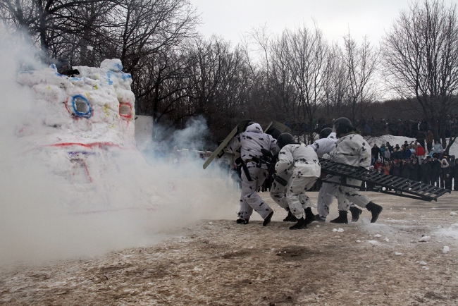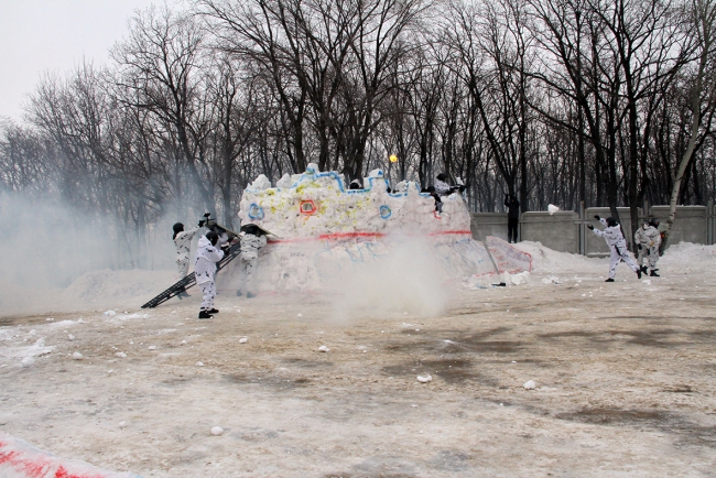 Одним из самых захватывающих зрелищ оказался штурм снежного замка. Группа спецназовцев, прикрываясь щитами, пошла на приступ снежного замка. Для того чтобы взять «укрепление» устроили дымовую завесу.