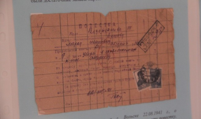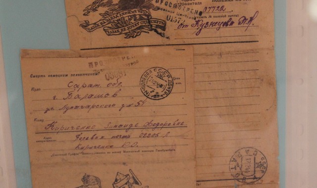 На выставке представлены письма, отправленные из Саратовской области, на почтовых штампах которых срезаны названия населенных пунктов Республики немцев Поволжья. Как известно, она была упразднена в 1941 году после начала войны, на изготовление новых штампов не было времени и средств. В экспозиции представлены такие виды исключительно военной корреспонденции, как повестки и похоронки.