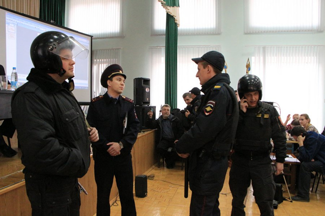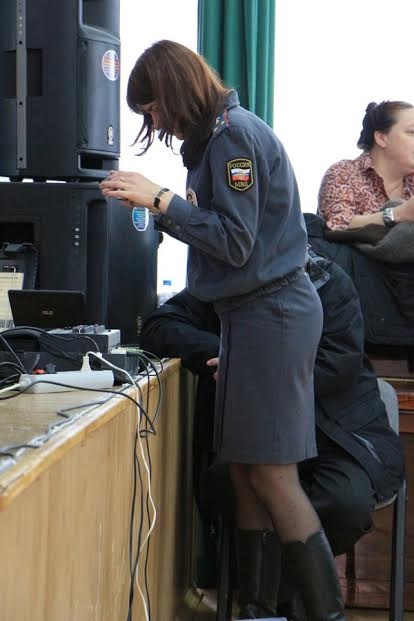 Спустя несколько минут в зал вошла сотрудница полиции, чтобы сфотографировать поврежденный кабель микрофона.