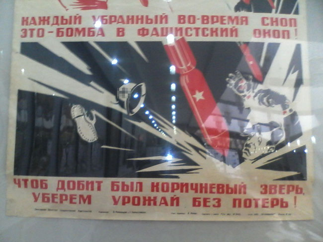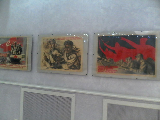 В холле Саратовской областной думе открыли выставку плакатов времен Великой Отечественной войны. Среди прочих изображений на них присутствует изображение фашистской свастики: на шлеме, который спадает с головы Гитлера.