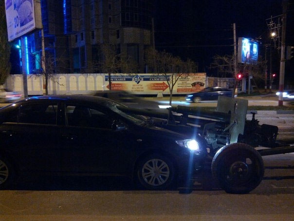 Вчера вечером на улице Тельмана в Энгельсе Саратовской области в автомобиль «Тойота Королла» врезалось артиллерийское орудие времен Великой Отечественной войны. По сообщениям очевидцев, военную технику после выставки на центральной площади города перевозил эвакуатор, с которого она скатилась из-за порвавшегося троса.