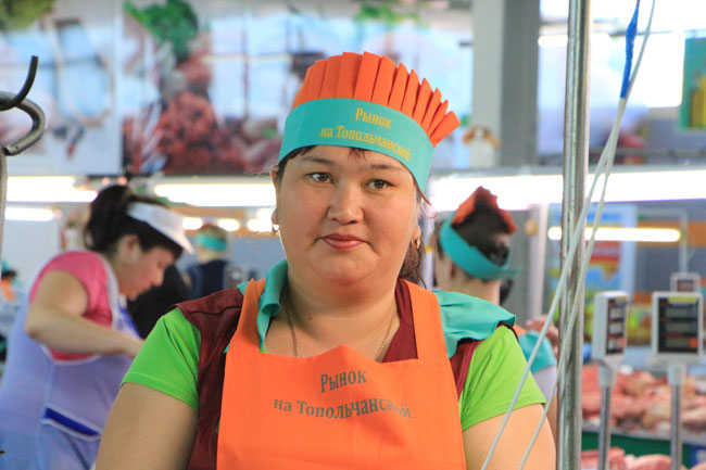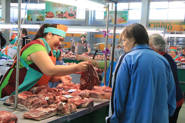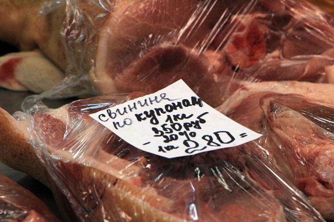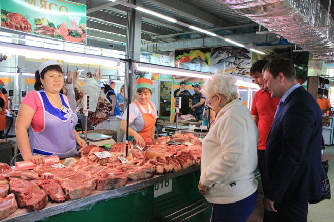 В самом здании рынка «На Топольчанской» участников рейда встретил директор и радушно пригласил исследовать прилавки. Первой на очереди оказалась мясная продукция, которая реализуется по специальным купонам для пенсионеров. Резепова сразу заметила, что согласно информации на ценниках скидка предоставляется весьма внушительная. Однако проверяющих смутила надпись на одном из прилавков: «Мясо по талонам». Они пошутили, что это возвращает людей в 90-е годы и рекомендовали сформулировать ее более дипломатично.
