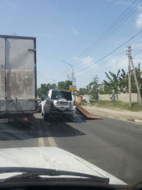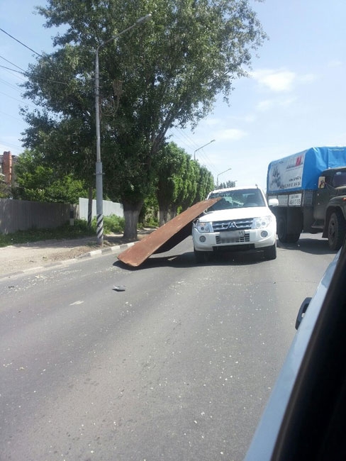 Как сообщают очевидцы, автомобиль «Мицубиси Паджеро» ехал по Ново-Астраханскому шоссе в сторону Саратов-3. Между 1-м и 2-м Артельными проездами с впереди ехавшего «КамАЗа» вылетел груз – лист металла. Он разбил лобовое стекло иномарке и приземлился с правой стороны внедорожника.